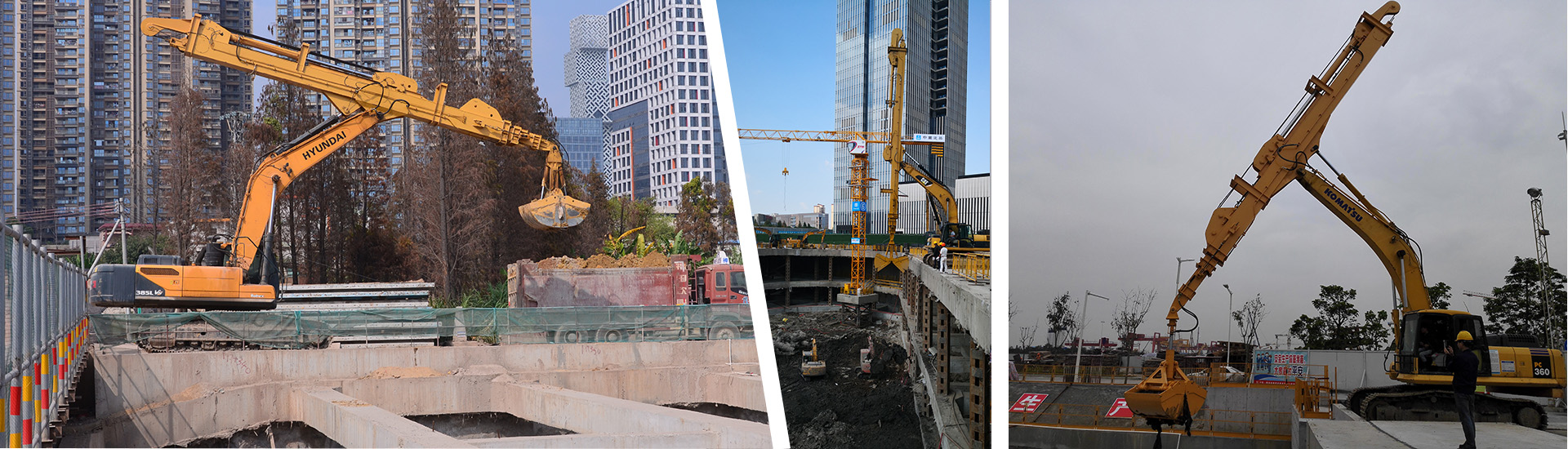 产品主要有:挖掘机标准臂、挖掘机加长臂、二段式加长臂、拆楼臂、抓木器、挖斗、抓钢机、松土器、液压震动打桩锤等挖掘机前端装置。产品行销60多个国家和地区,已为众多地铁施工、水电站、核电站、市政工程、河涌清淤等大型工程项目提供产品配套服务。